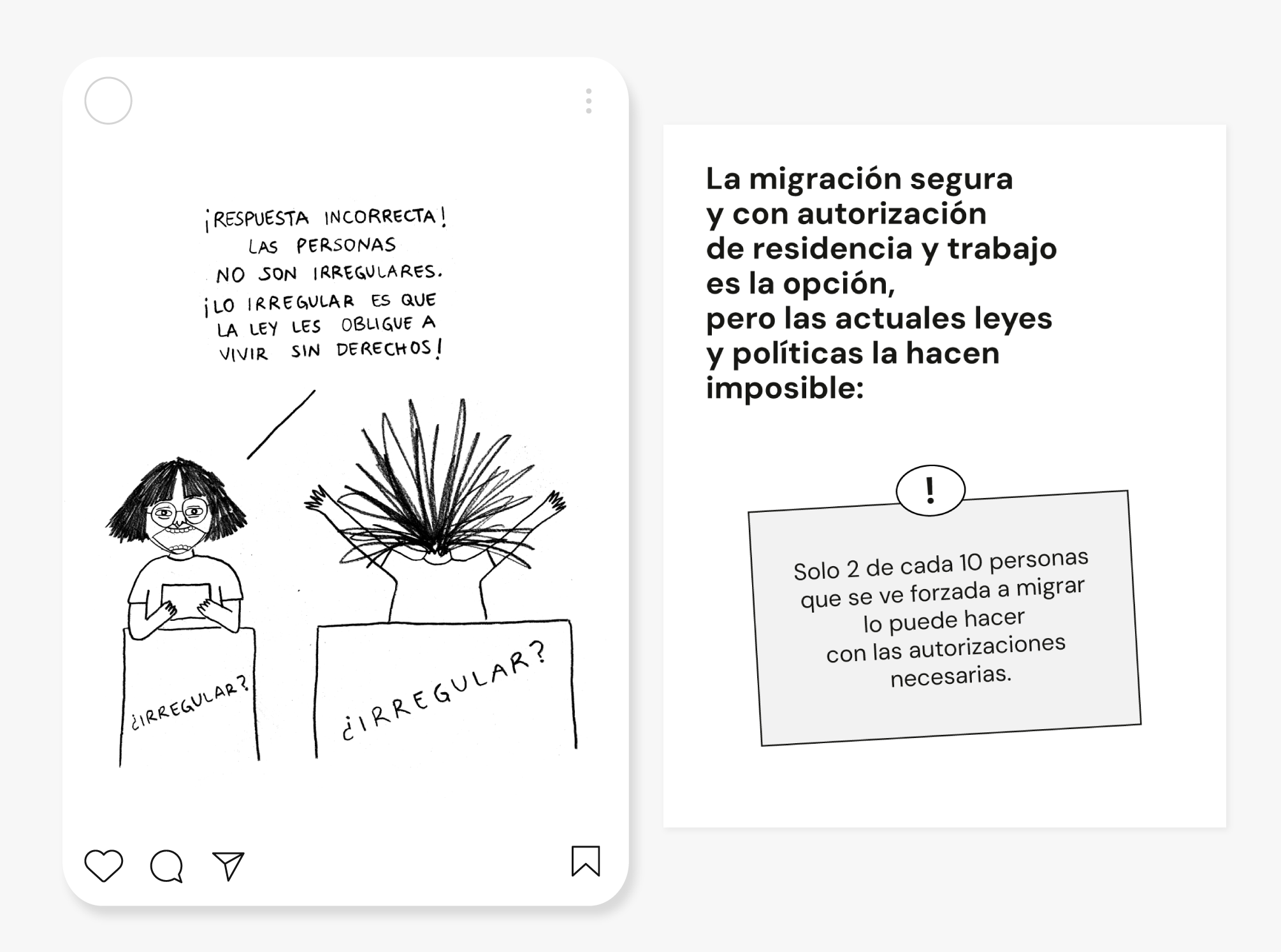 Un cop elaborat el marc estratègic comú, l'hem posat en pràctica amb una gran campanya. Amb el concepte "Una situación irregular", la campanya vol sensibilitzar sobre les irregularitats que genera el sistema legal envers les persones que es veuen forçades a migrar sense autoritzacions i per vies no segures.