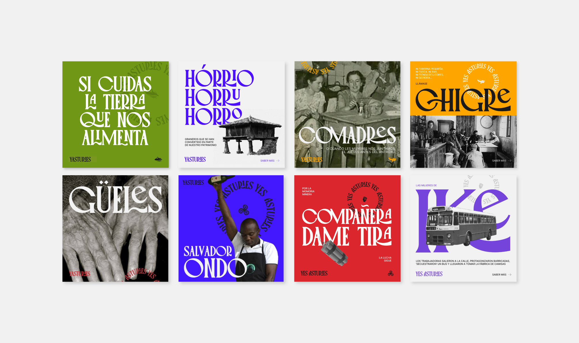 La nostra proposta va ser concebre una campanya digital i física amb un nom, identitat visual i narrativa capaç d’establir aquest vincle. Es va dissenyar una identitat que incorpora conceptes i codis visuals propis d’Asturies amb un llenguatge visual potent i flexible per donar cabuda a totes les línies de contingut.